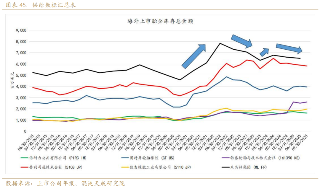 2026年海外的天胶需求能否逆转,核心点在于国际胎企的补库周期能否在明年开启。而海外胎企的库存周期影响因子有二,一是利率环境,二是政策影响。2025年美联储降息周期已经开启,明年继续扩表的概率偏高,这一点为胎企补库减弱了现金流利息压力,进一步增进了2026年外海胎企开启补库周期的可能性。而政策方面最大变量主要是EUDR,EUDR改变了国际胎企的库存小周期以及补库斜率。以米其林为例,目前其库存总金额仍然未降至2023年底补库时的水平,预示了2026年的上半年可能仍然为国际胎企的去库周期,进入补库周期需要更多的时间消化EUDR之前超补的库存。