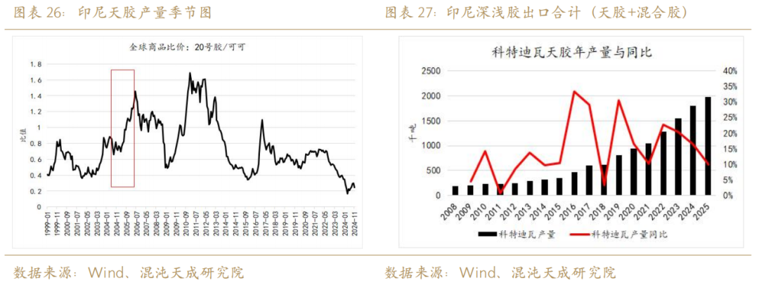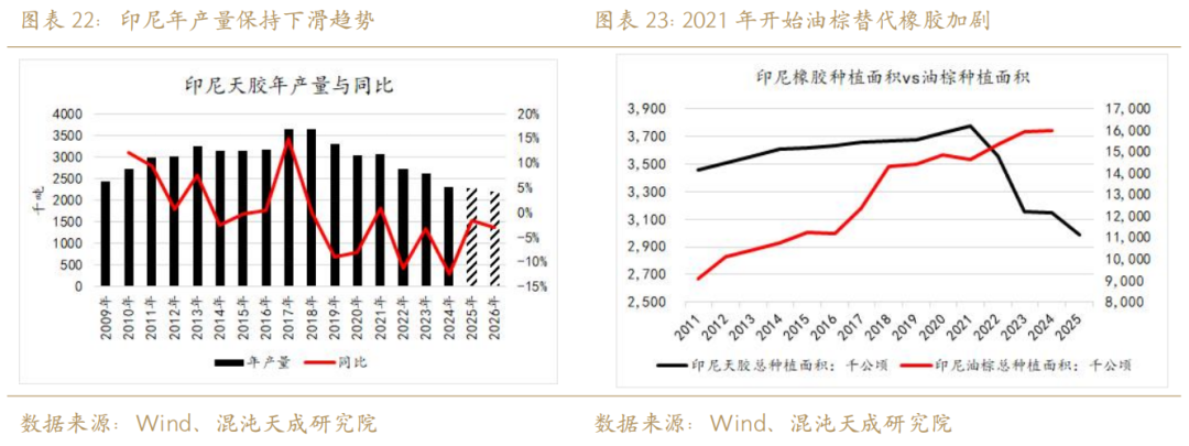 2025年四季度印尼累积产量可能在50万吨左右,同比去年四季度下滑10%,2025年产量可能在226.7万吨附近,同比下滑1.8%;而2026年印尼年产量可能在220万吨附近,同比2025年下滑3%。这一推理的背景,来源于2021年开始印尼天胶种植面积的大幅下滑和对应的油棕替代效应加剧。基于印尼迁都以及其主要经济作物的转化,难以从小周期角度发生改变,我们认为大概率印尼将维持减产趋势。