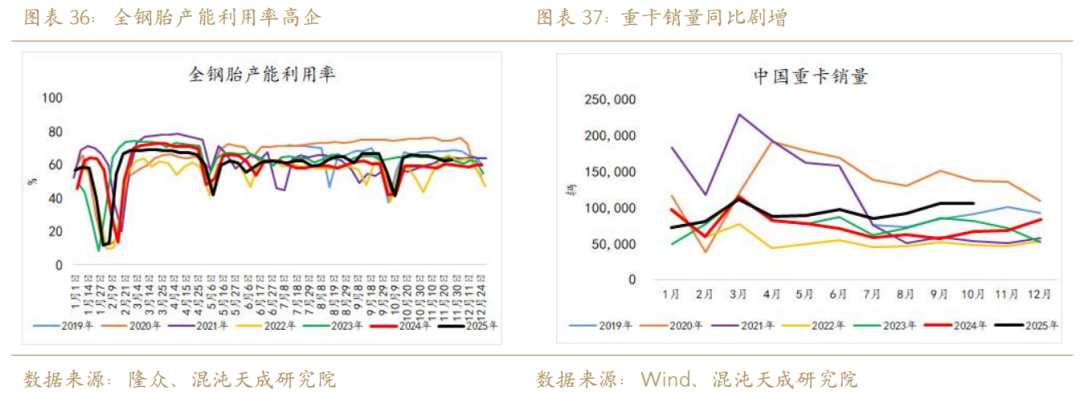 展望方面,我们认为2026年中国轮胎总产量或继续保持同比增长,但增速可能放缓,核心逻辑一是政策端对汽车(包括重卡)产销的托底效益可能会转弱,其政策持续性待观察;二是国内胎企的轮胎加工产能严重过剩带来的成品库存过高的问题始终需要时间消化。政策方面展开来说,本应受地产基建数据走弱而拖累的全钢胎今年表现偏强,主要得益于国补政策换代下重卡同比销量的大幅走高。数据显示,1-10月我国累计重卡销量92.76万台,同比去年大幅度增长23.84%。半钢胎方面展开来说,其核心增长逻辑在于配套轮胎增量,而需要注意的是最新数据显示我国乘用车11月的总体销量(含批发)与零售量出现环同比的巨大劈叉:据乘联分会初步统计显示,2025年11月全国乘用车市场零售量为226.3万辆,同比下降7%,较上月增长1%。据中汽协最新数据显示,11月我国汽车销量达342.9万辆,环比增长3.2%,同比增长3.4%。11月乘联会披露的零售数据与中汽协披露的总销数据劈叉,揭示了目前我国汽车产量高企但消费跟进出现乏力的情况,2026年我国汽车产销量要再创高增长或面临一定瓶颈,综上我们对2026年我国的整体轮胎产量增速下调。