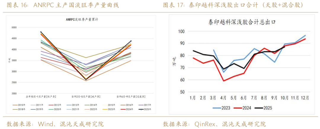 让我们结合行情及产量曲线进行复盘:24年10月到25年1月的旺产供应压力带来了25年一二季度的胶价探底,25年2月到5月的淡季产量不及预期再次支撑了三季度橡胶的估值修复行情。而25年四季度,市场对后续供应压力的担忧来自于主产国出口数据再一次走高: 10月泰印越科合计深浅胶出口87.2万吨,环比增长4.8%;1-10月泰印越科合计累积深浅胶出口790.7万吨,同比去年同期增长5.3%。