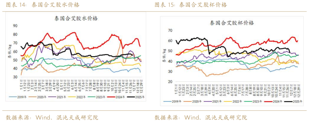 关于2025年橡胶加权的行情走势有很多扰动因子,我们依旧认为原料产量是核心驱动。从原料的角度来验证,洪水结束后的胶杯价格显著回落,所谓洪灾未能对产能造成不可逆影响,高价刺激产量的这一预期确实兑现了。从11月28日到12月8日,泰国中央市场的胶杯报价由52.95泰铢/kg降至47.69泰铢/kg,仅不到两周时间骤降约5泰铢。