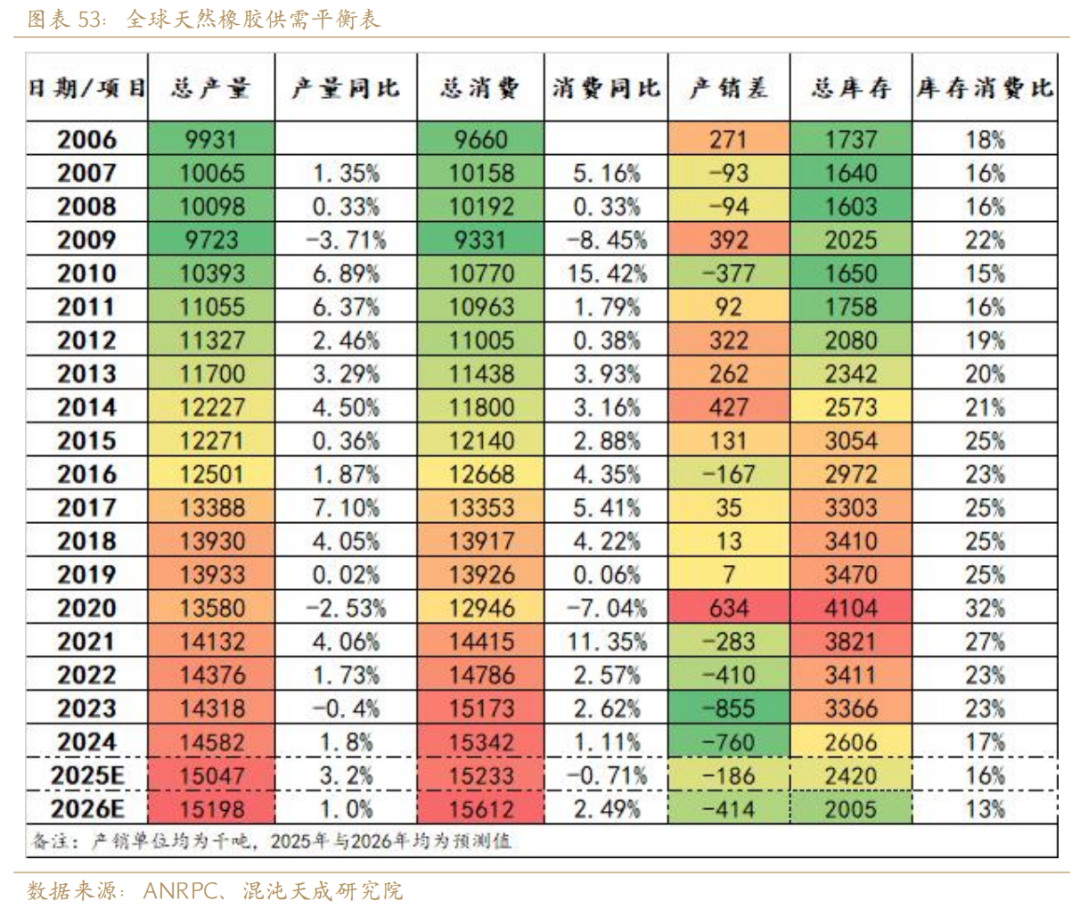 供应端:2025年为拐点之论纠偏的一年,产量同比增长或达3%;未来由于全球天然橡胶总产能见顶下滑的确定性较高,而高价刺激供应的这一效应已维持较长周期或难见新增量,故而2026年或仅保持全球天胶总产量小幅增长1%,同比增幅显著低于25年,这一预期兑现的天气条件在于26年四季度不发生厄尔尼诺。