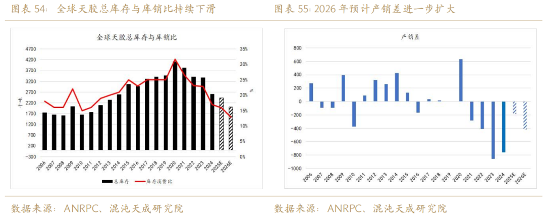 2025年全球天胶总供应出现高增长,总需求略微下调,但全球供需由过剩转向缺口的拐点在2021年已现,后续年份的总需求仍然大于总供给,2025年或全年继续保持缺口格局但缺口显著收敛。2026年预计总供应继续保持增长但增速放缓,总需求有望在配套需求修复和替换需求稳定增长的环境下回暖,宏观方面定调降息后的流动性充裕环境以及中美关系缓和带来的贸易战风险降低,预计全年供需缺口进一步放大,全球总库存降至216万吨左右,库销比达到历史最低位的13%。