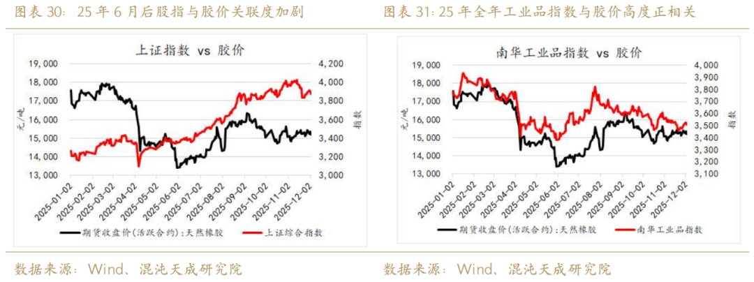 2025年对天胶来说是宏观大年,时间线:上半年关税战带来全球经济衰退预期,后续悲观预期未能兑现之下胶价谨慎回暖,下半年国内反内卷带动低位商品全面反弹。相关性方面,胶价与股指、工业品指数走势上有着高度的拟合——这一点源自于天胶自身复杂的基本面属性,即供应端具备农作物生长周期规律,需求端跟随经济预期与工业品需求。作为一个商品,天然橡胶更注重现实而非预期,这一点使得工业品指数与胶价的拟合度远高于股指与胶价,故而橡胶交易节奏在宏观还是自身供需矛盾,需要观察工业品指数走势与胶价走势是否存在劈叉。