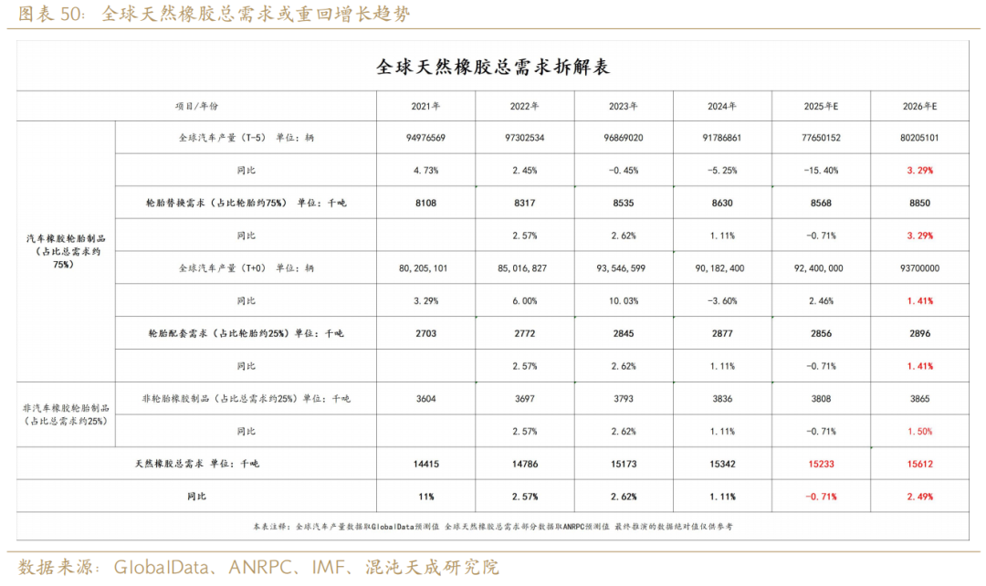 在直观地观测天胶需求前,我们需要在全球汽车轮胎与耗胶量上建立一个相关性概念——全球天然橡胶总需求斜率直接对应全球轮胎总产量斜率,全球轮胎总产量减去总销量得到终端蓄水池的变化量,关于这一点可以直接观测国内外胎企的成品库存。那么决定全球轮胎总产量的全球轮胎总需求由两部分组成:过去5-7年的全球汽车保有量决定的当年轮胎替换需求 + 当年全球汽车总产量决定的轮胎配套需求。需要注意的是,由于新冠疫情的扰动,2020年全球汽车总产量同比大幅下滑,对应的可能是2025年全球汽车轮胎替换需求的减少,这一点从过去5年全球汽车总产量同比平移曲线与全球天胶年消费量同比曲线的高度拟合可以验证。而根据过去5年全球汽车总产量同比平移曲线的延展,可预见未来三年的轮胎替换需求将同比大幅增长,逆转2025年的颓势(这里强调的是疫情导致替换胎需求小周期错配,26年后有望开启修复)。在上面的推演中我们用过去的汽车产量推演了保有量,从而锚定了轮胎替换需求的变化基准,那么在轮胎需求的另一侧——配套需求来看,当期汽车总产量是其定性的核心要素。据GlobalData产量预测显示,2025年轻型车产量预计将同比增长2.4%达9240万辆;2026年球轻型车产量预计将同比增长1.4%达9,370万辆。总体来看,2025年全球汽车产量增速较快,2026全球汽车产量增速可能变得温和,故而2026年全球轮胎配套需求继续保持同比增长但增速可能放缓。