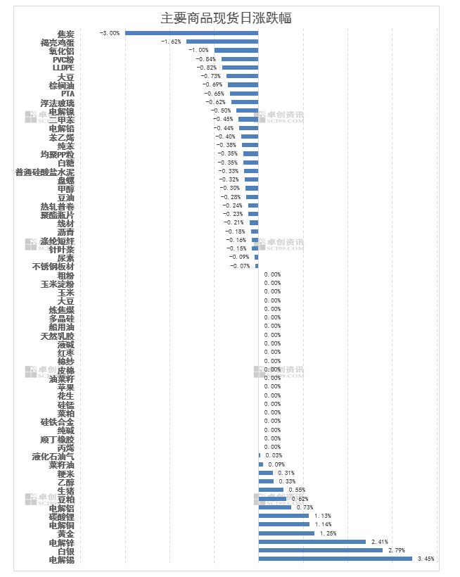 12月12日,卓创资讯(301299)监测商品现货市场13种上涨、28种下跌,21种企稳。能源化工板块偏弱震荡,PVC、LLDPE等品种跌幅居前;贵金属板块强势领涨,白银以2.79%涨幅居前,黄金同步涨1.25%,板块热度突出;有色金属板块多数走强,电解锡、电解锌分别涨3.45%、2.41%;农产品板块走势分化,豆粕、生猪分别上涨0.62%、0.55%,褐壳鸡蛋跌1.62%领跌板块;黑色系板块多数保持企稳,少数品种小幅下跌。(价格涨跌幅均以卓创资讯监测现货商品均价或主流市场价格计算)
