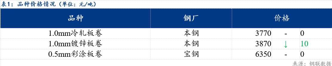 冷轧方面:今日上海冷轧板卷价格暂稳,1.0mm本钢价格3770元/吨。镀锌方面:今日上海镀锌板卷价格下跌10元/吨,1.0mm本钢价格3870元/吨。彩涂方面:今日上海彩涂板卷价格暂稳,0.5mm宝钢价格6350元/吨。