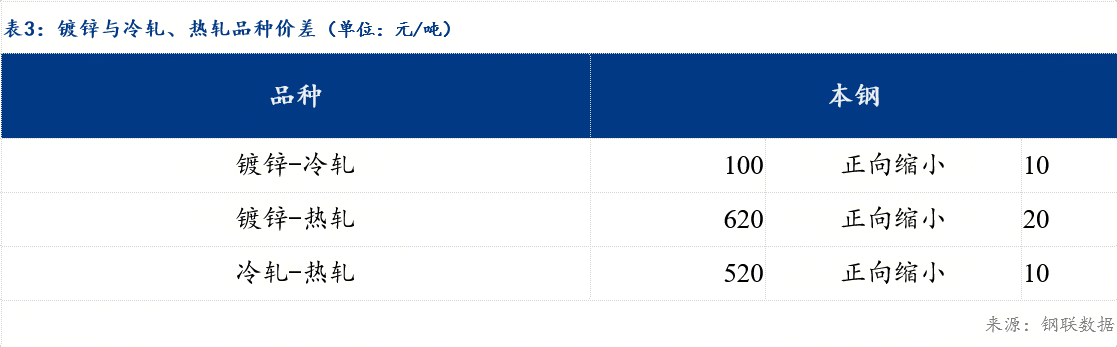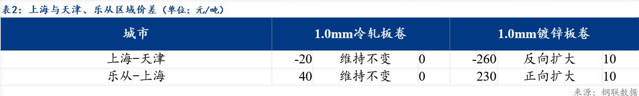 区域价差方面:今日上海-天津冷轧板卷价差-20元/吨,较上一交易日持平;镀锌板卷价差-260元/吨,较上一交易日扩大10元/吨;乐从-上海冷轧板卷价差40元/吨,较上一交易日持平;镀锌板卷价差230元/吨,较上一交易日扩大10元/吨;品种价差方面:今日上海镀冷价差100元/吨,较上一交易日收窄10元/吨;镀热价差620元/吨,较上一交易日收窄20元/吨;冷热价差520元/吨,较上一交易日收窄10元/吨。