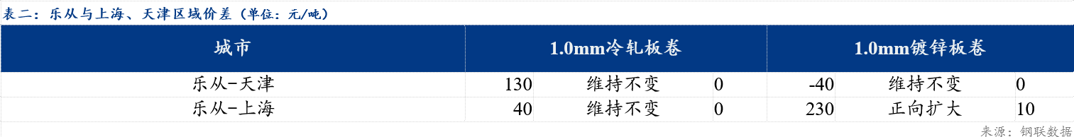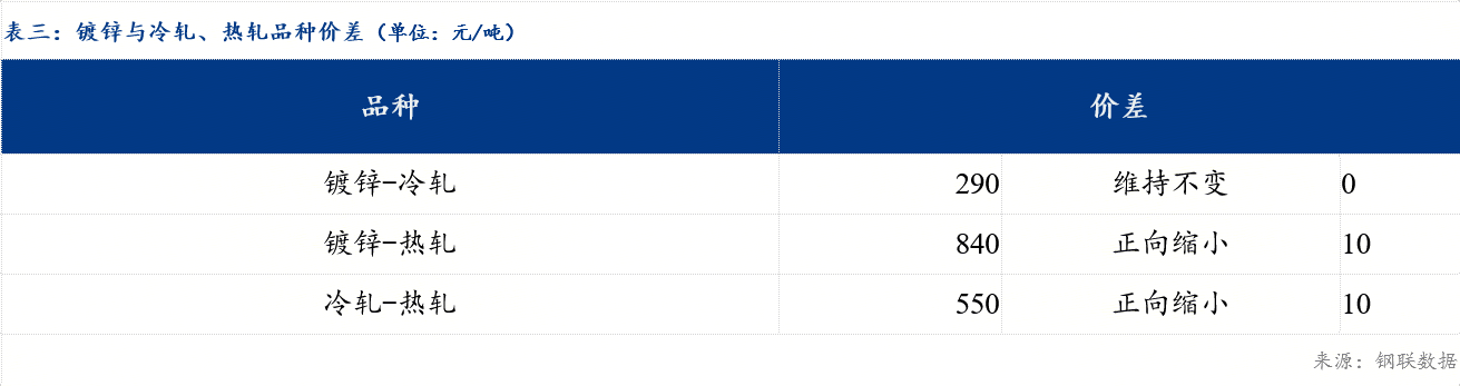 今日冷轧板卷乐从与天津价差较上一交易日持平,乐从与上海价差较上一交易日持平;镀锌板卷乐从与天津价差较上一交易日持平,与上海价差较上一交易日扩大10元/吨。品种价差方面,镀冷价差较上一交易日持平,镀热价差较上一交易日收窄10元/吨,冷热价差较上一交易日收窄10元/吨。