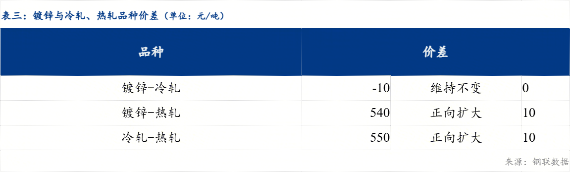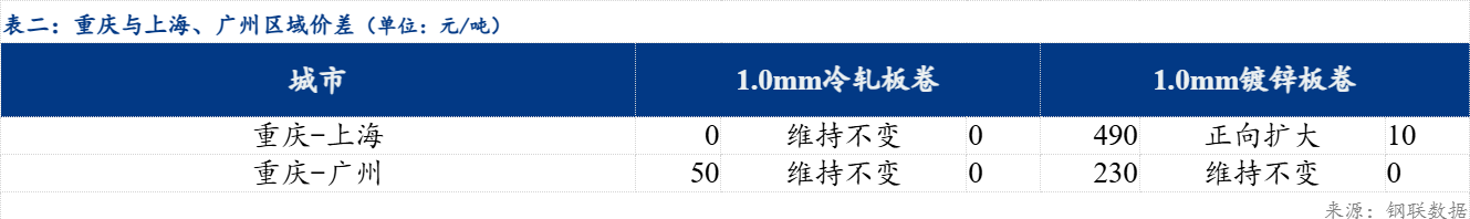 重庆、上海地区冷轧板卷区域价差维持不变0元/吨;重庆、广州冷轧板卷区域价差维持不变0元/吨。重庆、上海镀锌板卷区域价差正向扩大10元/吨;重庆、广州镀锌板卷区域价差维持不变0元/吨。镀锌、冷轧品种价差维持不变0元/吨;镀锌、热轧品种价差正向扩大10元/吨;冷轧、热轧品种价差正向扩大10元/吨。