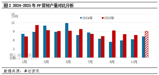 根据卓创资讯(301299)测算,2025年12月份国产PP管材料供应有所增量,预计产量在9.08万吨,环比增加1.36万吨。月内PPB管材产量在0.77万吨,环比减少0.13万吨,PPR国产产量在7.72万吨,华北增加1.4万吨。12月份PP管材产量除前期在产装置产量释放外,部分前期检修装置重启亦增加管材排产,整体供应端小幅增量。月内冷水管材产量处于减量状态,虽然供应端减量对市场底部支撑仍在,但去库压力较大下,市场或继续维持降价去库策略,对市场支撑一般。而热水管材来看,随着前期检修的装置广州石化、镇海炼化以及利和知信等企业增量恢复对管材的排产,供应端增量明显,且大厂因预期需求谨慎,原料备货操作暂未集中启动下,热水管材端压力增加明显,月内继续承压运行。