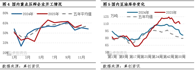 国内大豆进口量维持高位,压榨企业原料供应充足,整体维持高开工负荷,豆油产出宽松。虽然华南因豆粕出库有压力,被迫出现个别企业压榨及精炼产线全部或分批停机,但豆油供应量整体依然较大。据卓创资讯(301299)数据显示,上周(12月1日-12月7日)为57.28%,本周(12月8日-12月14日)预计为64.50%,环比上升7.22个百分点,豆油产量增加4.39万吨。