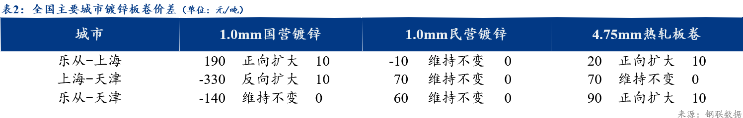 【区域价差】国营资源:乐从-上海价差为190元/吨,上海-天津价差为-330元/吨,乐从-天津价差为-140元/吨。民营资源:乐从-上海价差为-10元/吨,上海-天津价差为70元/吨,乐从-天津价差为60元/吨。