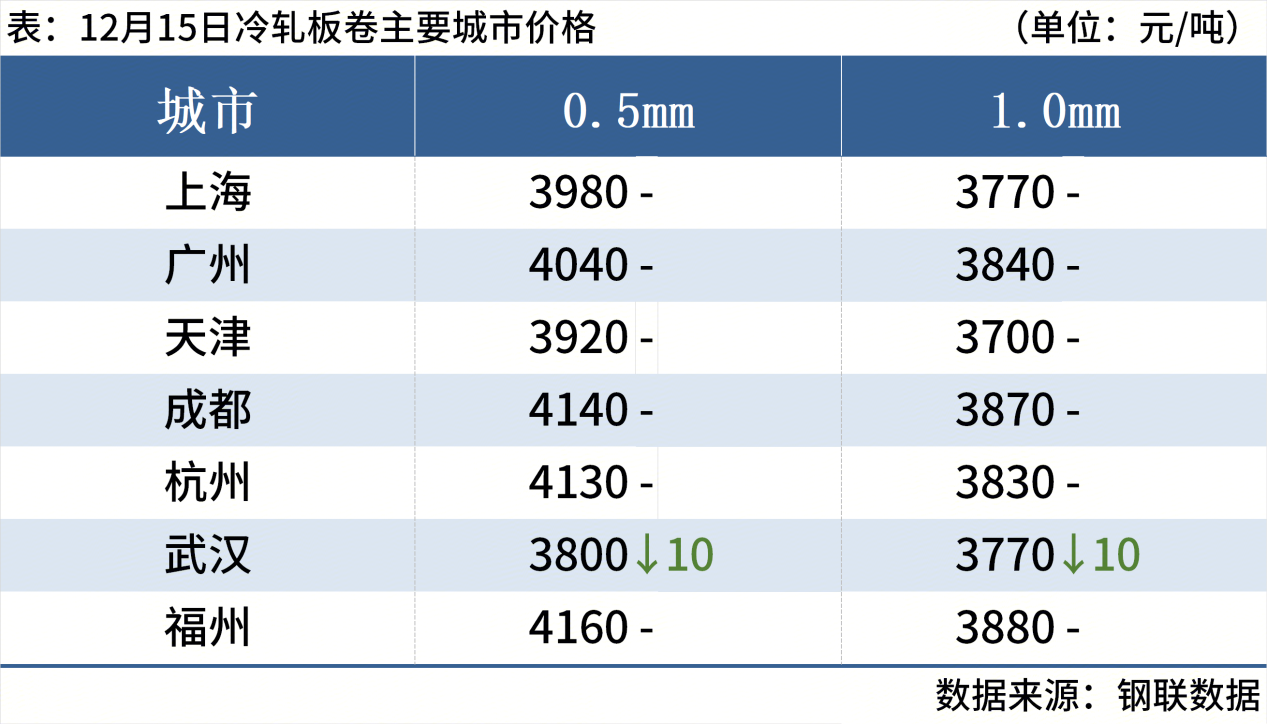 冷轧板卷:12月15日,全国24个主要城市1.0mm冷卷均价3881元/吨,较上一交易日下跌2元/吨。据贸易商反馈,从西南地区本地钢厂出台的最新结算价格来看,相较市场冷轧现货价格下跌幅度,结算价格调整幅度差强人意。多数贸易商反馈现货基本倒挂,加上终端需求惨淡,整体出货不畅,心态依旧表现悲观。综合来看,预计16日冷轧价格将继续震荡运行。