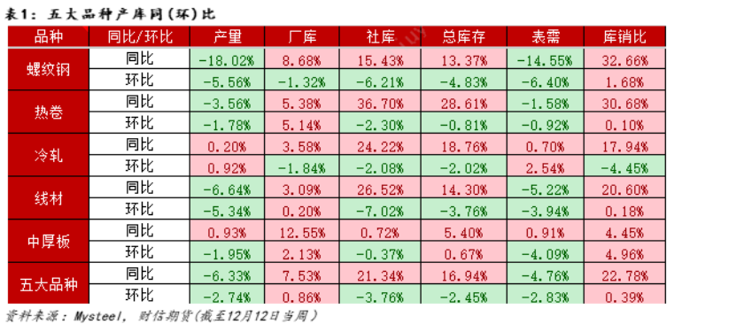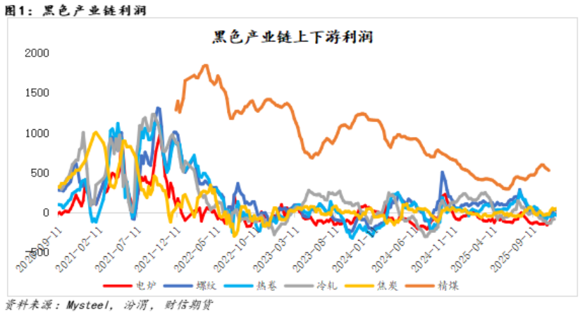 从黑色产业链利润角度来看,黑链上游让利润态势延续,但钢厂利润仍待改善。截止12月12日当周,吨精煤利润继续回落;吨焦盈利环比继续改善;以螺纹热卷冷轧为代表的主流钢材品种吨钢即期利润环比都有所下降。原料焦煤让利向下游传导有所受阻,焦炭现货仍面临提降压力(短期成本支撑仍显不足)。