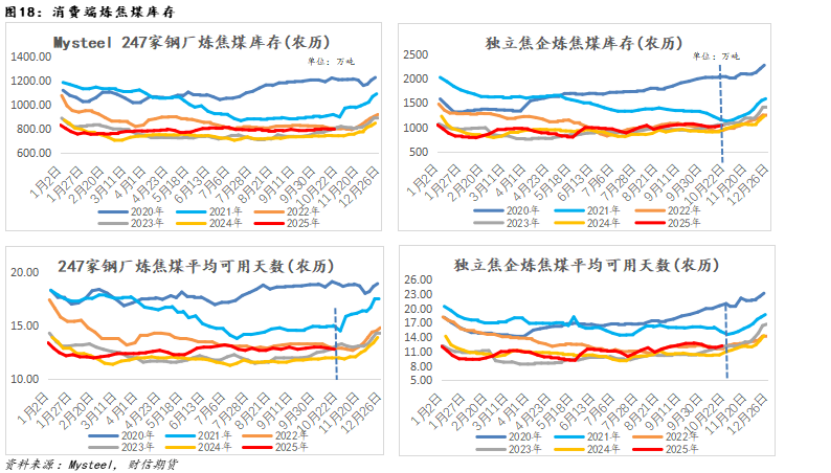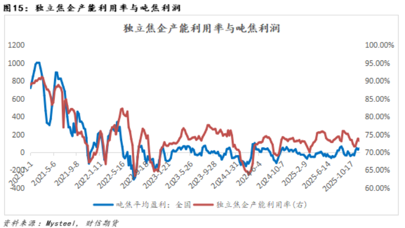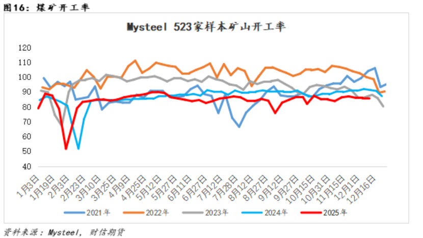 炼焦煤方面,弱现实与弱预期格局需下游补库来打破,静待原料冬储启动。受部分煤矿切换工作面及完成年度目标任务影响,国内煤矿开工率环比有所下降,但蒙煤通过维持高位且26年仍有增量预期,在下游补库未启动之前,焦煤现货上行驱动不足。