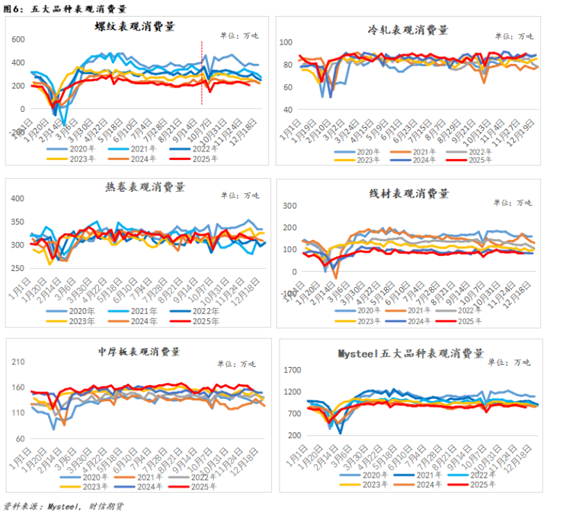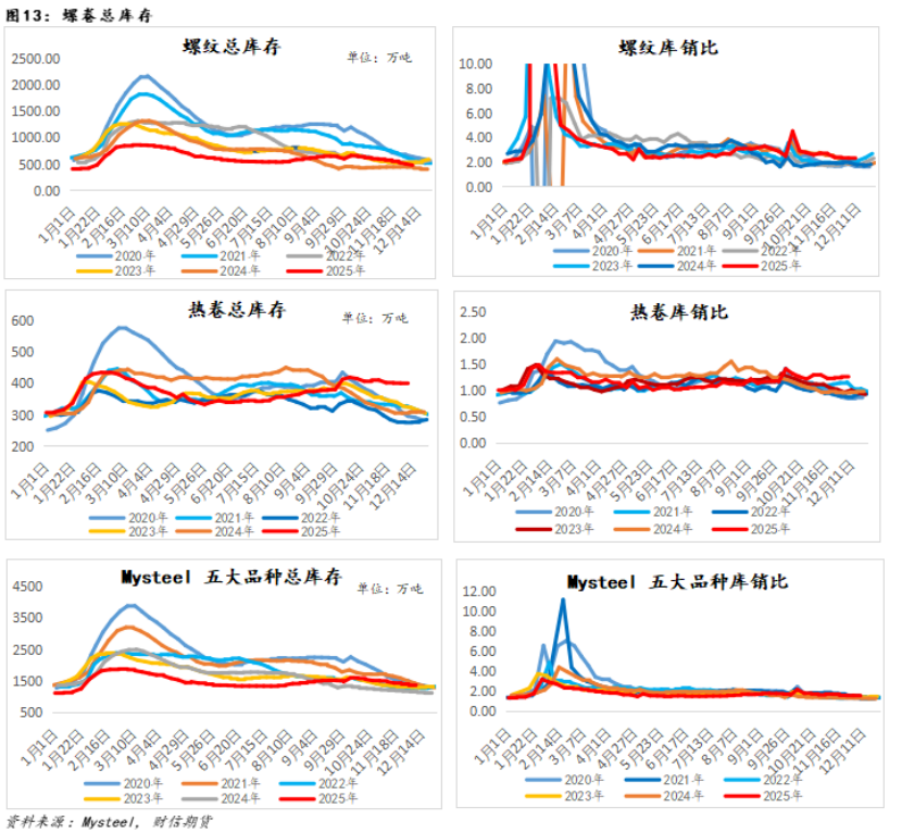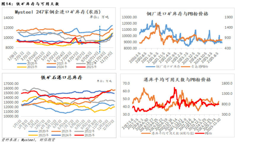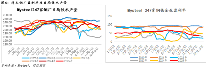 钢厂季节性停产检修增多,叠加利润驱动不足,铁水产量延续回落态势。据Mysteel调研,截止12月11日,247家样本钢厂日均铁水产量为229.2万吨,环比下降3.1万,已低于去年同期水平;样本钢企盈利率为35.93%,环比下降0.43个百分点。从铁水产量季节性走势来看,产量进入季节性下滑态势。后期重点关注元旦后钢厂复产力度。从粗钢调控角度来看,1-11月粗钢产量累计同比下降4%,折累计下降3715万吨。近日国家发改委释放出“以双碳为引领加快推进全面绿色转型。稳步实施碳排放总量和强度双控制度,完善配套制度,强化评价考核,严控新增“两高”项目”,市场对26年粗钢产量仍有收缩预期。