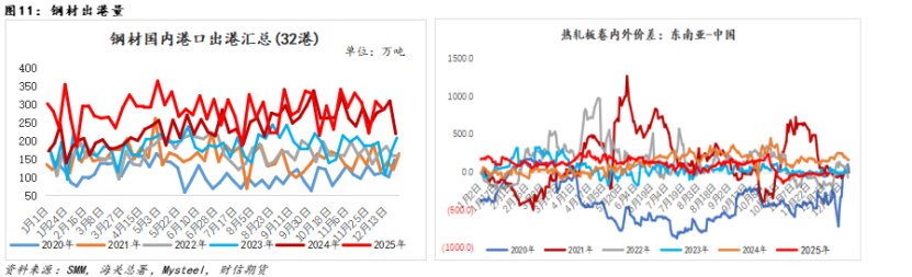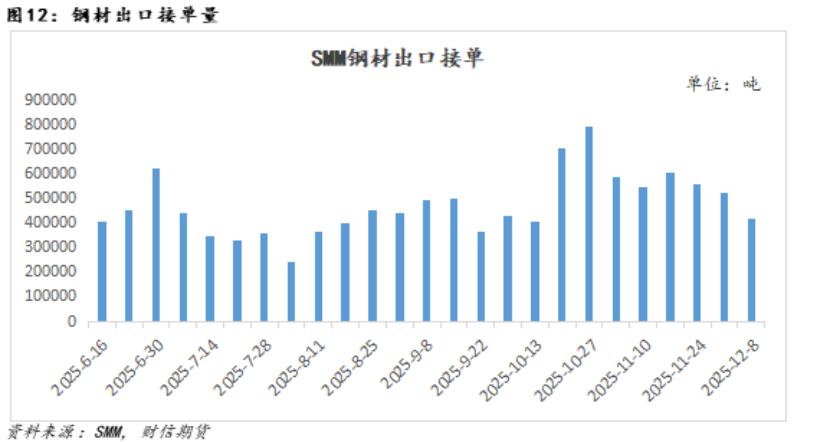 从钢材直接出口角度来看,钢材出港量环比转降,钢厂接单量持续下降背景下,短期钢材出口量或仍有下降空间。据SMM,25年第50周,32港钢材出港量为287.14万吨,环比下降21.85万吨。从内外价差来看,截止12月12日,热卷内外价差下降由上周的-25.8回升至-8.9,出口动能有所回升。从钢厂出口接单量来看,截止12月8日,样本钢厂钢材出口接单量连续三周下滑。需值得注意的是,商务部、海关总署公布对部分钢铁产品实施出口许可证管理,自2026年1月1日起执行,短期部分企业可能出现出口转内销现象,或加大板材压力(不排除部分通过买单出口抢出口)。