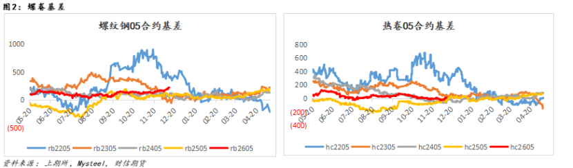 产业链利润传导:上游让利延续,吨煤利润回落,吨焦利润小幅修复,钢厂即期利润环比收缩。基差水平:螺卷05合约基差走强,但仍处中性区间。绝对估值:螺纹05合约价格位于生产成本下方,静态估值中性略低,下行空间受限。