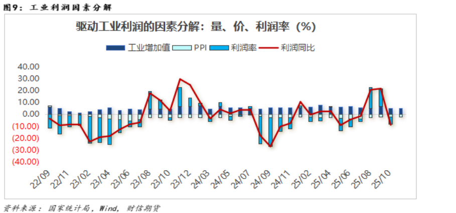 从钢材需求驱动来看,需求驱动整体偏弱。地产弱势未改,地产用钢需求仍是拖累项,基建投资受化债及投向影响,单月同比仍处于下行态势。制造业方面,从量、价及利润率角度来看,下游需求改善有限,工业企业利润仍待提振,下游补库意愿整体不强。