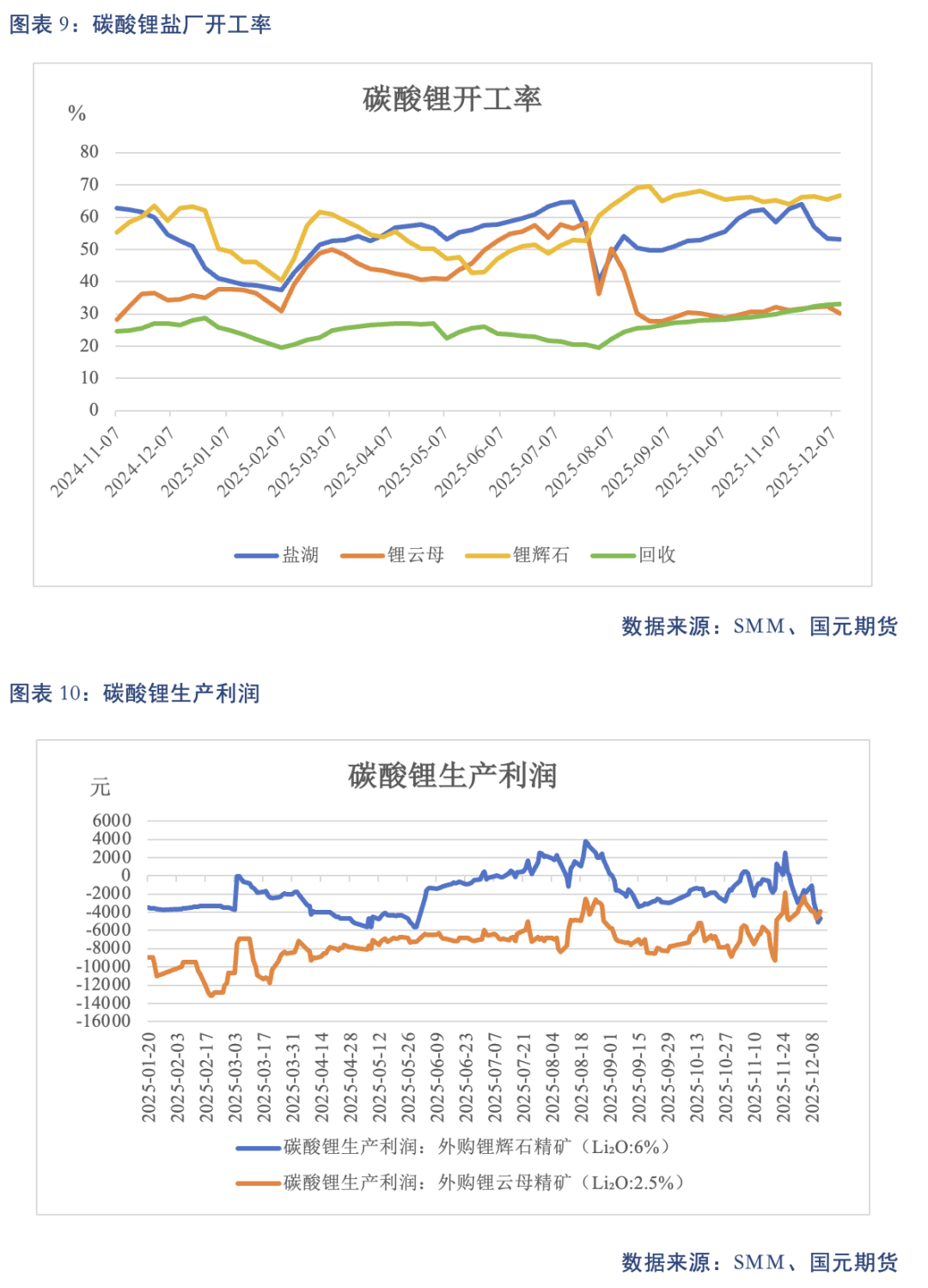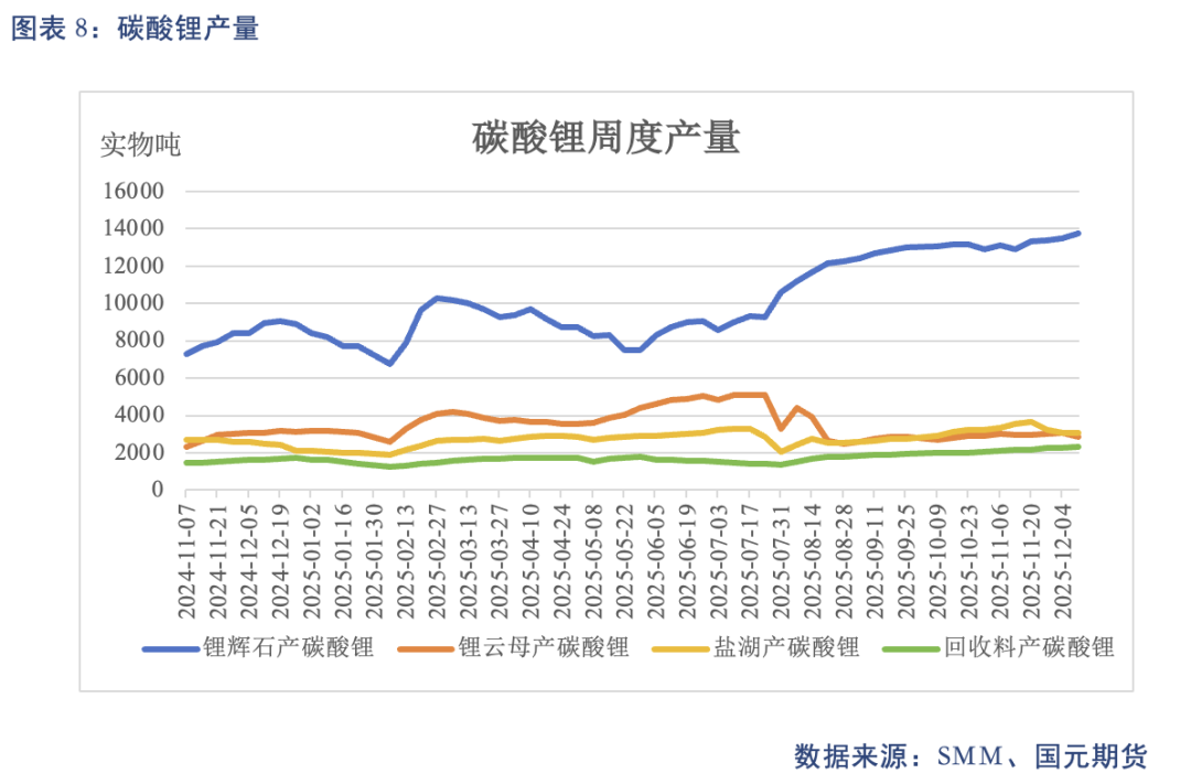 供应:辉石提锂方面,根据西澳港口发运数据,11月下旬及12月上旬发运锂辉石约15万吨,基本持平上月同期水平,澳矿整体发运或维持高位;非洲方面,近期尼日利亚矿山生产存在政策扰动,考虑到发运周期,对短期矿石供应影响有限。由于当前矿石价格给予矿山较大利润空间,预计短期辉石提锂原料端供应维持较高水平。但考虑到冶炼产能瓶颈限制,短期内辉石提锂或维持小幅增产。云母提锂方面,某大型矿山复产进度不及预期,云母提锂受原料供应限制,短期内产量难有明显增长。盐湖提锂方面,国内产线爬产与季节性减产并存,预计短期产量较前期持平;南美盐湖产量季节性恢复,叠加前期新投产产线爬产,南美盐湖发运量增加,国内锂盐进口或有明显增量。回收提锂方面,短期回收提锂仍面临废料供应不足限制,由于锂价高位给予回收湿法产线一定利润空间,短期内回收提锂产量小幅增长。
