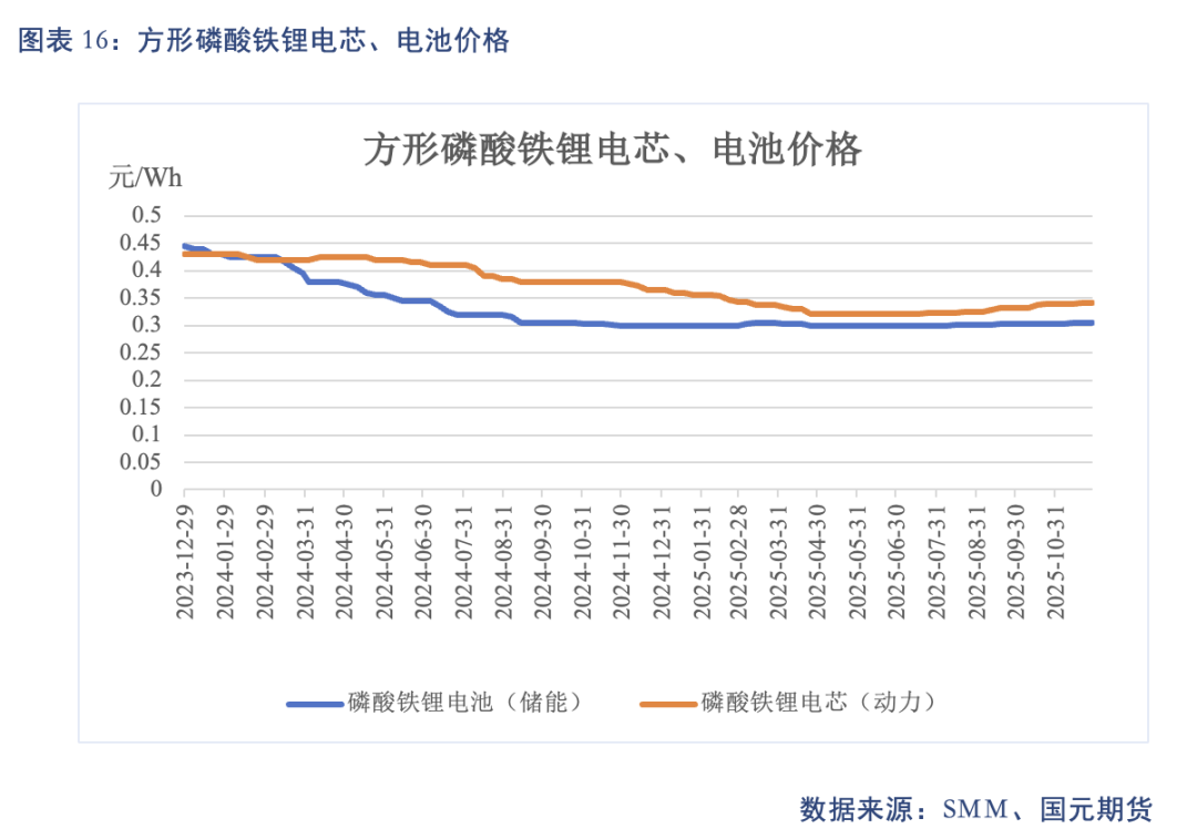 需求:12月电芯排产主要反映明年一季度需求,由于一季度为动力终端消费淡季,12月动力电芯排产出现一定程度下滑;储能电芯依旧处于供应偏紧阶段,尽管终端装机进度出现季节性放缓,但电芯厂出于备库以及交付订单等因素考量,12月排产环比基本持平。从正极来看,由于动力电芯排产下滑,叠加正极厂年底有去库需求,磷酸铁锂及三元材料排产均出现一定程度下降。