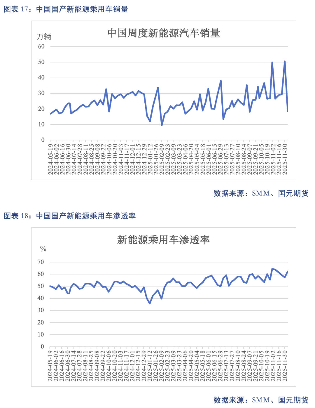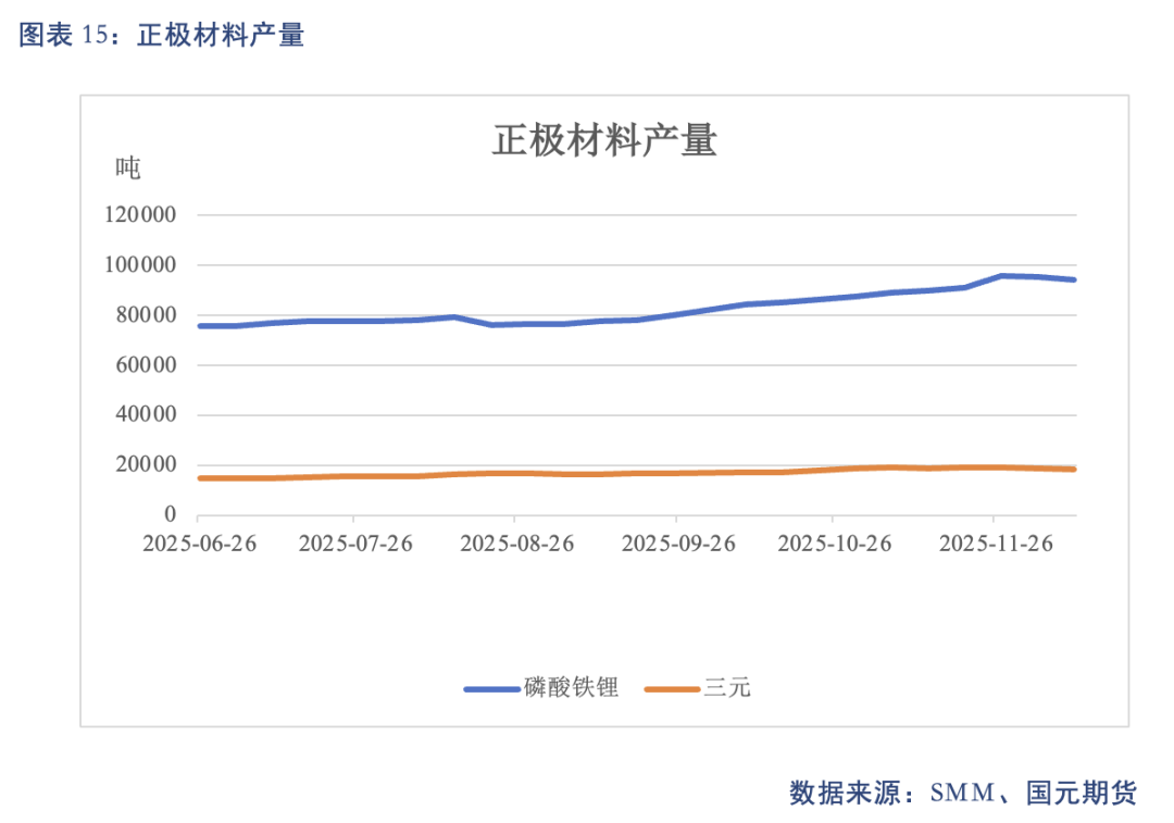 截至12月11日,三元材料产量为18313吨,较上周减384吨;磷酸铁锂产量为94144吨,较上周减1336吨。
