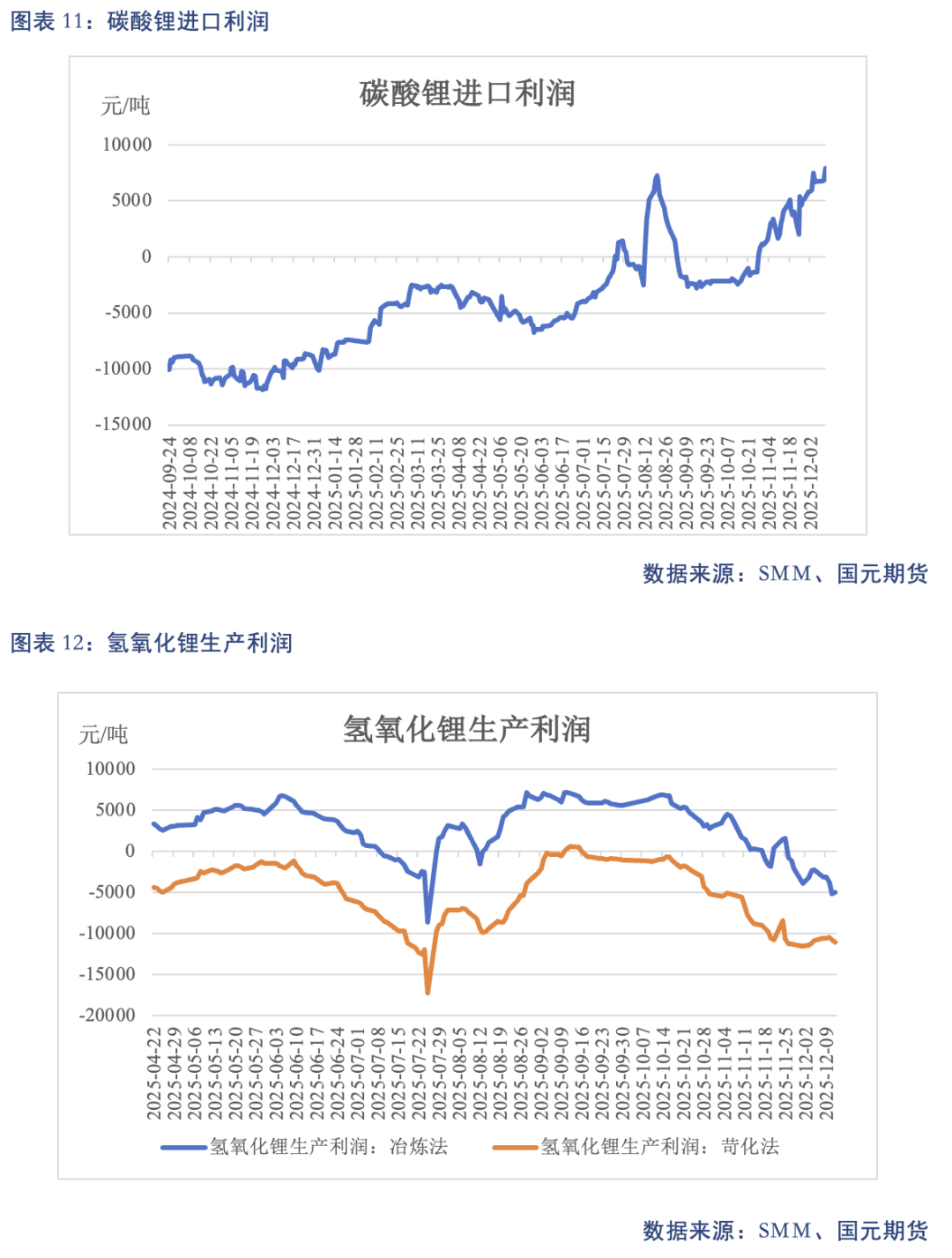 截至12月12日,碳酸锂进口利润为7892.9元/吨,较上周增1185.2元/吨。截至12月12日,冶炼和苛化产氢氧化锂利润为-4946元/吨和-11070元/吨,较上周减2676元/吨和减188元/吨。