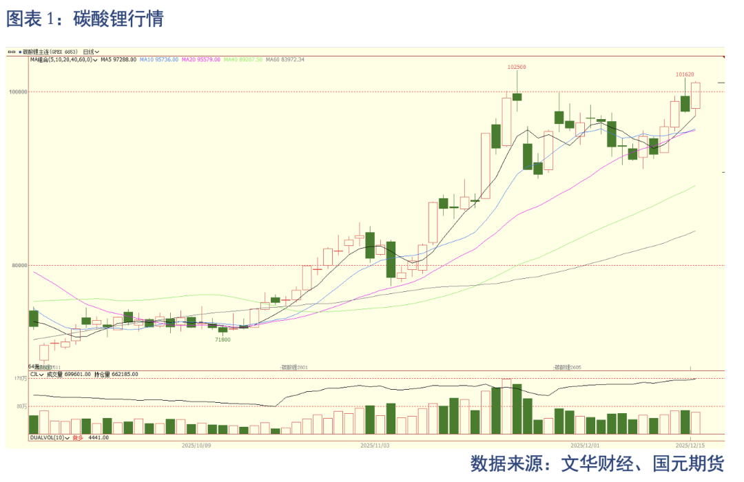 本周碳酸锂主力合约震荡偏强,12月12日收盘价97720元/吨,较上周涨6.03%。