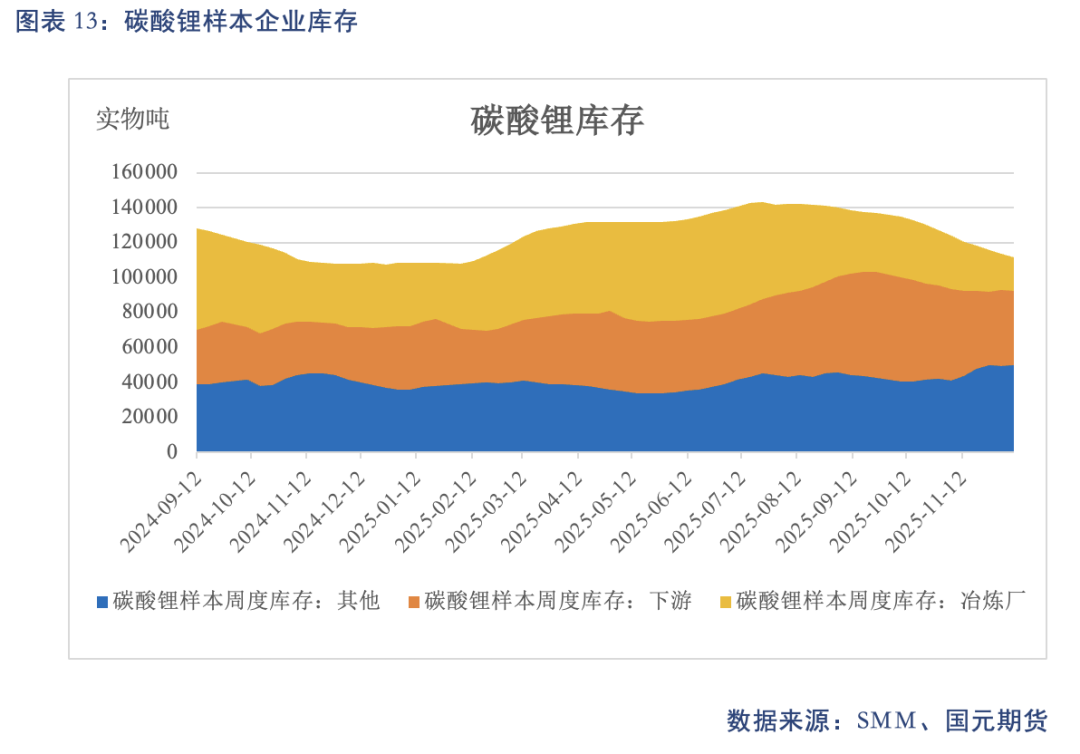 截至12月11日,冶炼厂碳酸锂库存为19161实物吨,较上周减1606实物吨;下游碳酸锂库存为42738实物吨,较上周减957实物吨;总计碳酸锂库存为111469实物吨,较上周减2133实物吨。