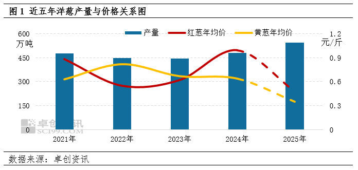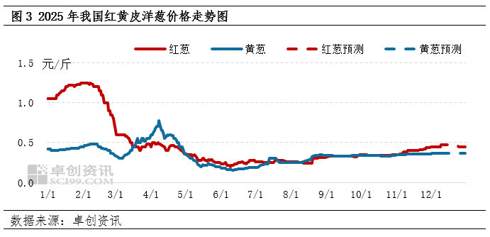 2025年我国洋葱年产量544.8万吨,同比增加64万吨,增幅13.31%,为近五年最高水平。作为季产年销的小宗农产品,宽松的供应格局为牵绊洋葱价格上涨的主要因素。截至12月15日,我国红皮洋葱年均价0.48元/斤,黄葱均价0.35元/斤,均为近五年同期的最低水平。
