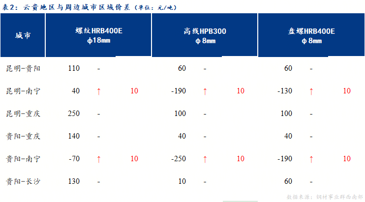 【区域价差】从区域价差来看,昆明与南宁价差扩大10元/吨;贵阳与南宁价差扩大10元/吨。