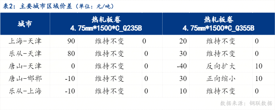 从区域价差来看,4.75mm普卷华南与华北价差80元/吨,华东与华北价差90元/吨,华南与华东价差-10元/吨。京津冀地区价差来看,唐山与天津价差0元/吨,唐山与邯郸价差-10元/吨 。