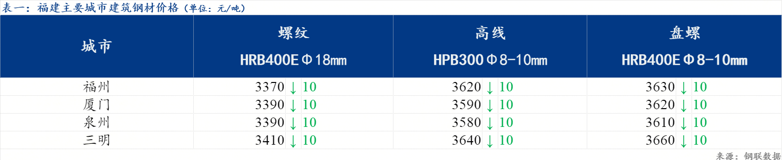4日福建市场建筑钢材价格小幅松动,福州三钢螺纹钢3370元/吨,较上一个交易日下跌10元/吨;厦门三钢螺纹钢3390元/吨,较上一个交易日下跌10元/吨。