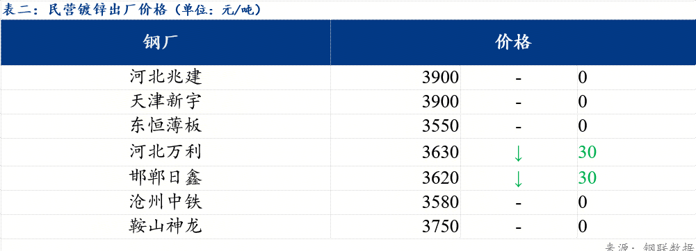 今日北方民营钢厂镀锌出厂指导价在3550-3900元/吨。