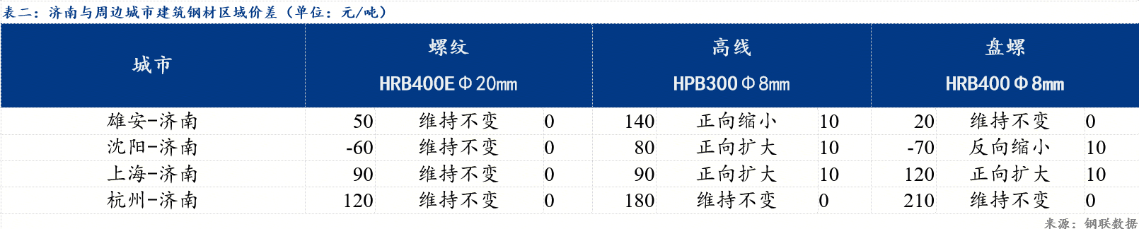 今日南北地区各主要市场价格稳中偏弱运行,区域价差变化不大。具体来看,上海市场螺纹钢价格高于济南市场90元/吨;杭州市场螺纹钢价格高于济南120元/吨;雄安市场螺纹钢价格高于济南市场50元/吨;沈阳市场螺纹钢价格低于济南市场60元/吨。