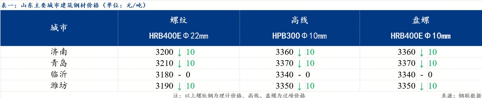 今日山东市场建材市场价格偏弱运行,部分市场下跌10元/吨。具体来看,济南市场价格跌10元/吨,螺纹钢价格3200元/吨,盘螺价3360元/吨;青岛市场价格跌10元/吨,螺纹钢价格3210元/吨,盘螺价格3370元/吨;临沂市场价格稳,螺纹钢价格3180元/吨,盘螺价格3340元/吨;潍坊市场价格跌10元/吨,螺纹钢价格3190元/吨,盘螺价格3350元/吨。