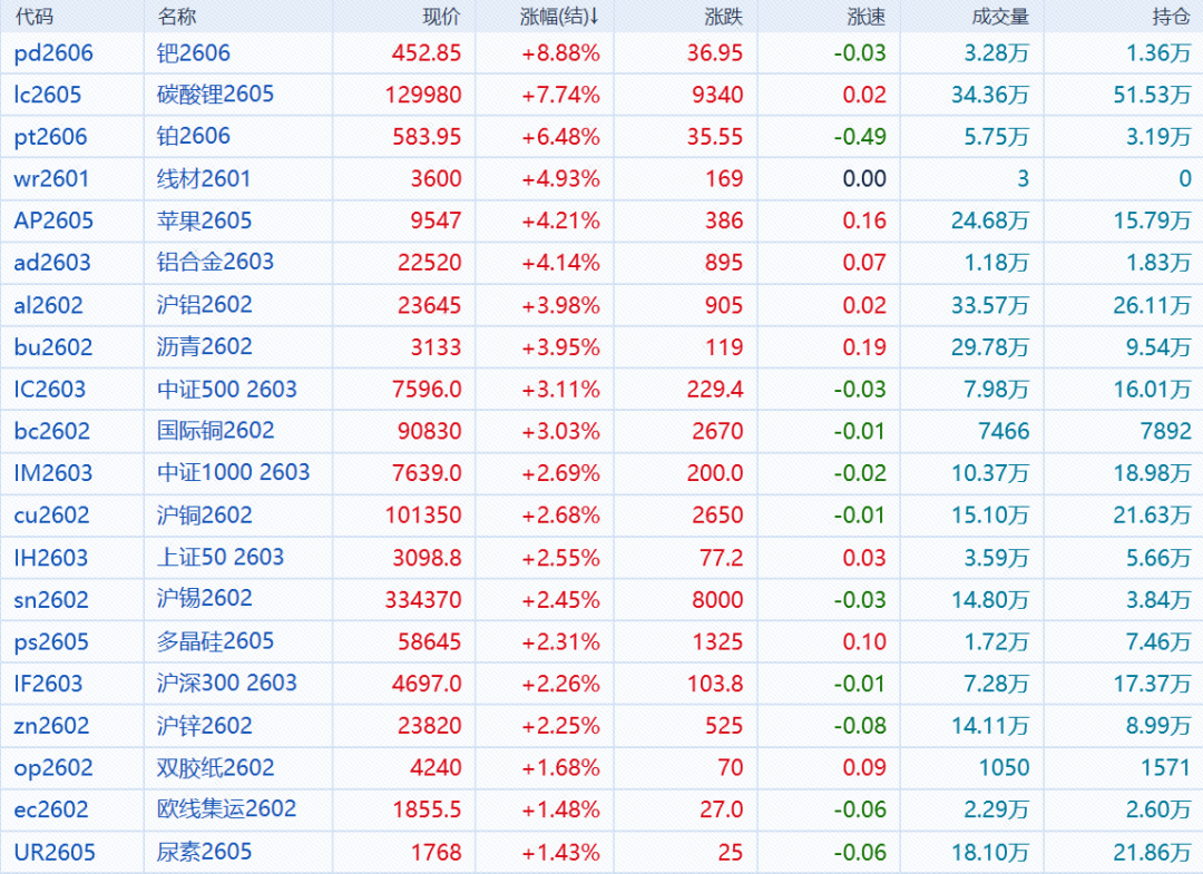 1月5日,午市收盘,国内期货主力合约涨跌不一,钯涨超8%,碳酸锂涨超7%,铂涨超6%,铝合金、苹果涨超4%,沪铝、沥青、国际铜涨超3%,沪铜、沪锡、多晶硅、沪锌涨超2%。跌幅方面,烧碱、SC原油、焦煤跌超3%,纯碱、焦炭、乙二醇、低硫燃料油跌超2%。