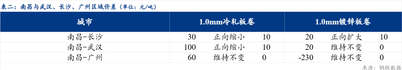 区域价差来看,冷轧品种,南昌-长沙价差为30元/吨,较上一交易日正向缩小10元/吨;南昌-武汉价差为100元/吨,较上一交易日正向缩小10元/吨;南昌-广州价差为60元/吨,较上一交易日维持不变。镀锌品种,南昌-长沙价差为20元/吨,较上一交易日正向扩大10元/吨;南昌-武汉价差为20元/吨,较上一交易日维持不变;南昌-广州价差为-230元/吨,较上一交易日维持不变。