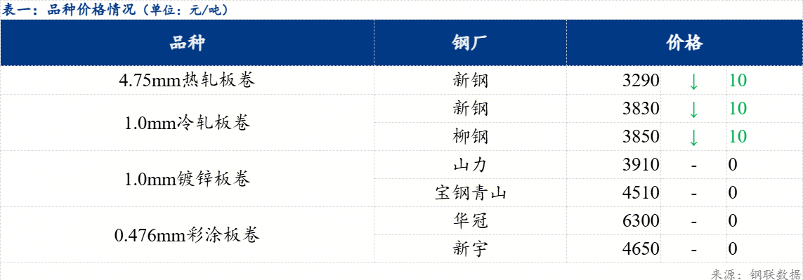 今日黑色系期货盘面震荡运行,原料热轧2605合约收盘价3248元/吨,较上一交易日跌幅0.79%,江西市场冷轧和镀锌板卷价格弱稳。截止收盘,新余热轧新钢4.75mm报价3290元/吨,较上一交易日下跌10元/吨;新余冷轧新钢1.0mm报价3830元/吨,较上一交易日下跌10元/吨 ;南昌镀锌山力兴冶1.0mm报价3910元/吨,较上一交易日暂稳,南昌彩涂天津新宇0.476mm报价4650元/吨,较上一交易日暂稳 。
