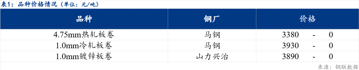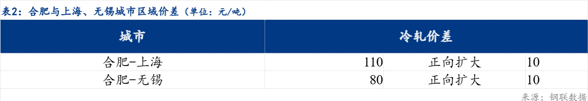 今日合肥-上海1.0mm马钢价差为110元/吨,较上一交易日正向扩大10元/吨;合肥-无锡1.0mm马钢价差为80元/吨,较上一交易日正向扩大10元/吨 ;品种价差方面:冷热价差550元/吨,较上一交易日持平。