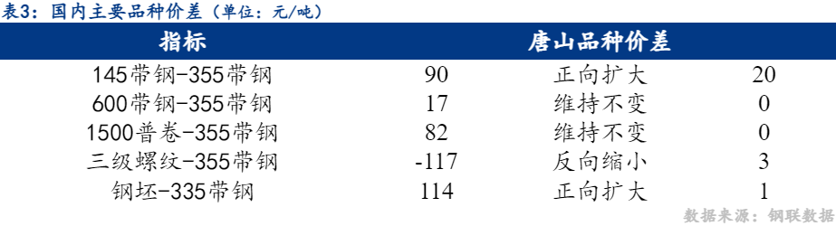 今日唐山市场1500普卷与带钢价差维持不变;螺纹钢与带钢价差反向缩小3元/吨。