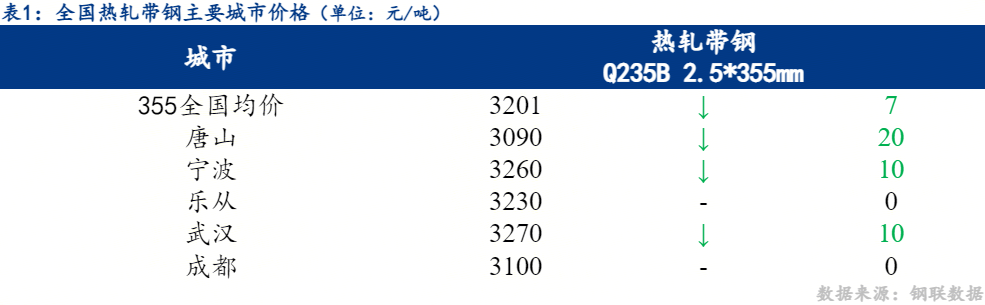 5日热轧带钢全国主要城市价格偏弱运行,截至发稿时2.5*355mm热轧带钢均价3201元/吨,较昨下跌7元/吨,其中2.5*355mm主要城市报价为唐山3090元/吨,宁波3260元/吨,乐从3230元/吨。