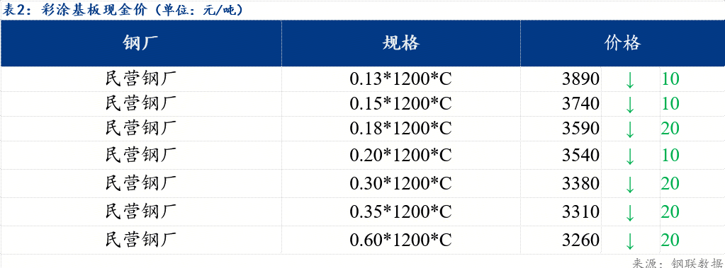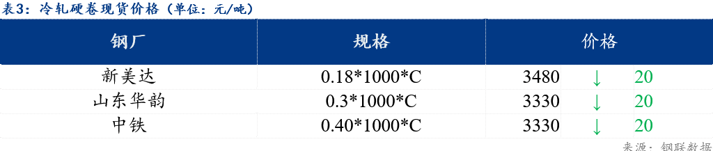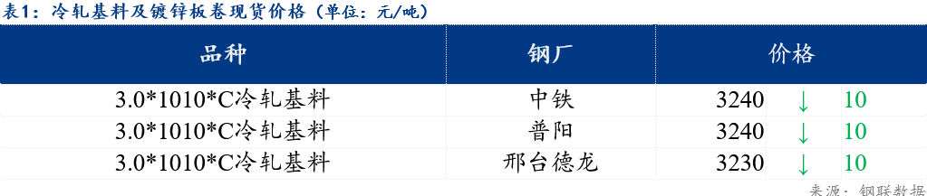 镀锌板卷0.3*1000*C山东华韵报价4110元/吨,较上个交易日价格下跌30元/吨;冷轧硬卷0.18*1000*C新美达出厂报价3480元/吨,较上个交易日价格下跌20元/吨;冷轧基料3.0*1010*C中铁报价3240元/吨,较上个交易日价格下跌10元/吨。