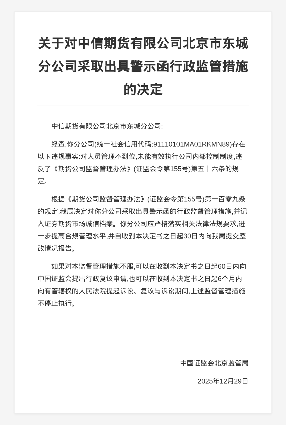 中信期货北京市东城分公司被出具警示函,涉人员管理不到位