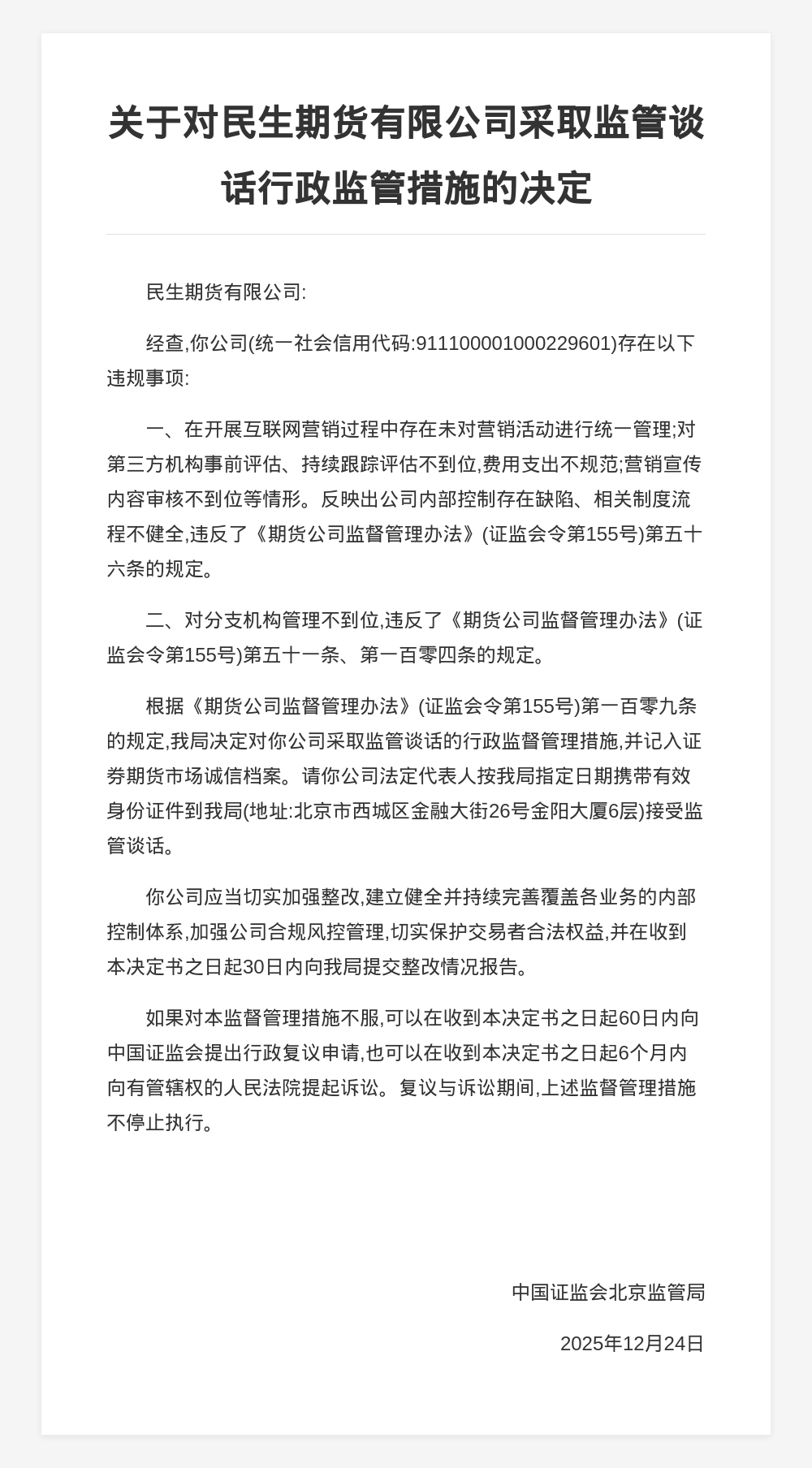 以上行为违反了《期货公司监督管理办法》的规定。中国证监会北京监管局决定对民生期货有限公司采取监管谈话的行政监督管理措施,并记入证券期货市场诚信档案。