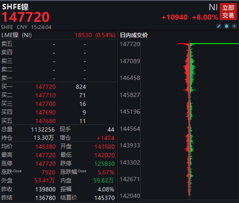 国际市场上,镍同样涨幅最大。隔夜LME期镍盘中涨幅一度突破10%,触及2024年6月5日以来最高位18785美元。截至收盘,涨8.95%,报每吨18524美元。