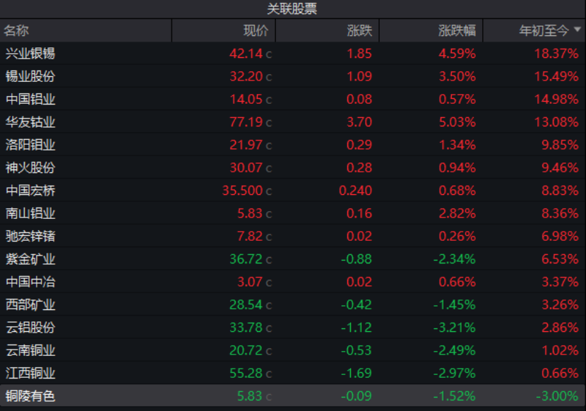 此外,锡业股份(000960)累计上涨15.49%,中国铝业(601600)累计上涨14.98%,华友钴业(603799)累计上涨13.08%。洛阳钼业(603993)、神火股份(000933)、中国宏桥、南山铝业(600219)、驰宏锌储、紫金矿业(601899)等个股累计涨幅均超5%。