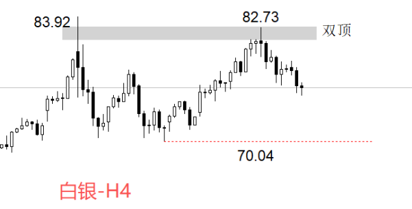 行情方面,四小时级别,白银形成了典型的双顶结构。83.92美元是历史最高点,82.73美元是次高点。两个价位相差不大,且所在K线均有长上影线特征,符合双顶结构的基本要求。下方支撑位在70.04美元,如果行情能够下跌至该价位,甚至有效突破70美元整数关口。那么,白银的逼空行情有望到此结束,未来有可能展开一轮明显会回调走势。