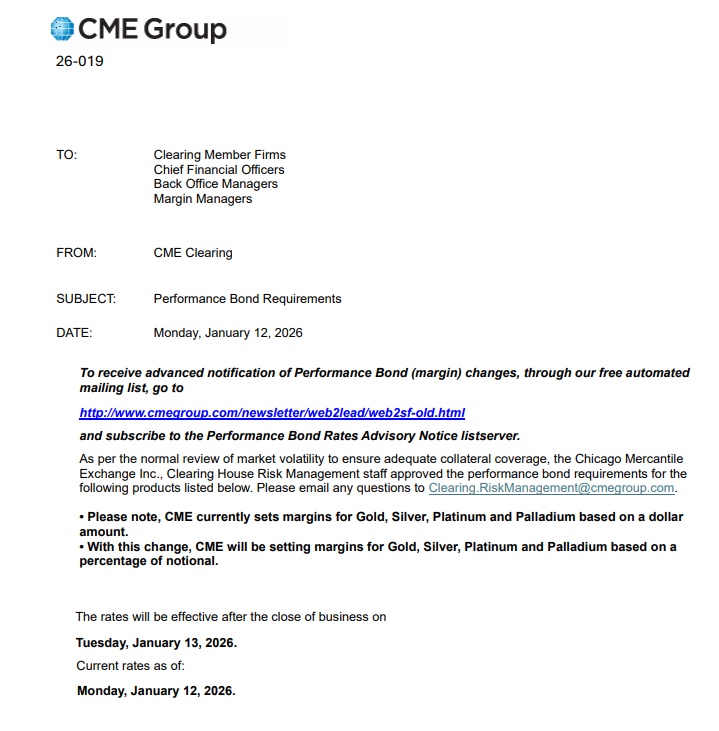 芝加哥商品交易所(CME)当地时间1月12日发布通知,根据对市场波动性的正常审查,为确保充足的抵押品覆盖,将改变黄金、白银、铂金和钯金合约的保证金设定方式,由此前的按照固定金额收取保证金,改为按照合约名义价值的一定比例计算保证金。相关费率将从1月13日收盘后生效。